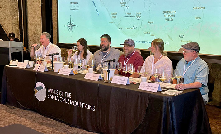 The event began with a late-morning seminar entitled “Chardonnay: The Santa Cruz Mountains Signature.” An exploration of one of the region’s best-known grape varieties, the seminar also presented a case for fruit from the Santa Cruz Mountains’ varied terroir and the winemakers who work with it producing the very finest Chardonnay in California. Moderated by noted wine writer Alder Yarrow of Vinography, the seminar panel featured five vintners whose Chardonnays represent some of the best in the Santa Cruz Mountains: Sarah Green of Neely Wines, Rob Bergstrom of Sandar & Hem Wines, Ryan Beauregard of Beauregard Vineyards, Lauren Lyall of Ridge Vineyards, and Jeff Brinkman of Rhys Vineyards. Each of the five presented two of their Chardonnays for the seminar attendees to taste – one from their current vintage (all from 2023 and 2024) and one from an older vintage (ranging from 2021 back to 2012). The seminar format allowed us to taste and compare the five newer Chardonnays together and then to do the same with the older wines.