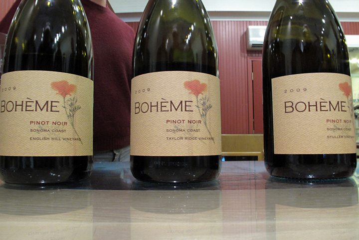 Bohème 2009 Pinot Noir - Taylor Ridge, Sonoma Coast. 100% Swan clone (propagated from Dehlinger's Octagon Vnyd). This wine had more black cherry nuances, and sweeter fruit, with Xmas spice and a nice earthy touch on the back end. Yield of 1.7 tons/acre.